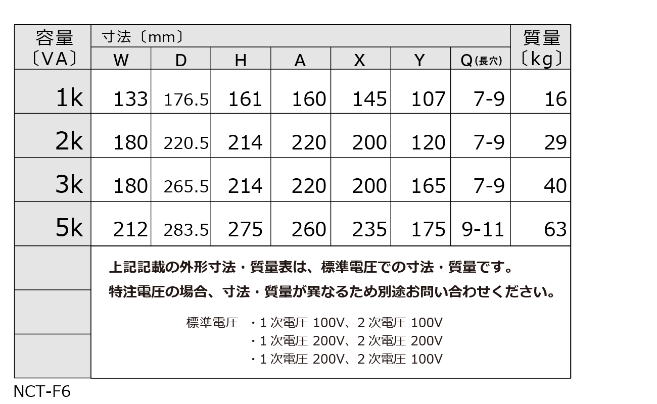 | 定格電圧 | ・1次電圧 100V、2次電圧 100V ・1次電圧 200V、2次電圧 200V ・1次電圧 200V、2次電圧 100V |